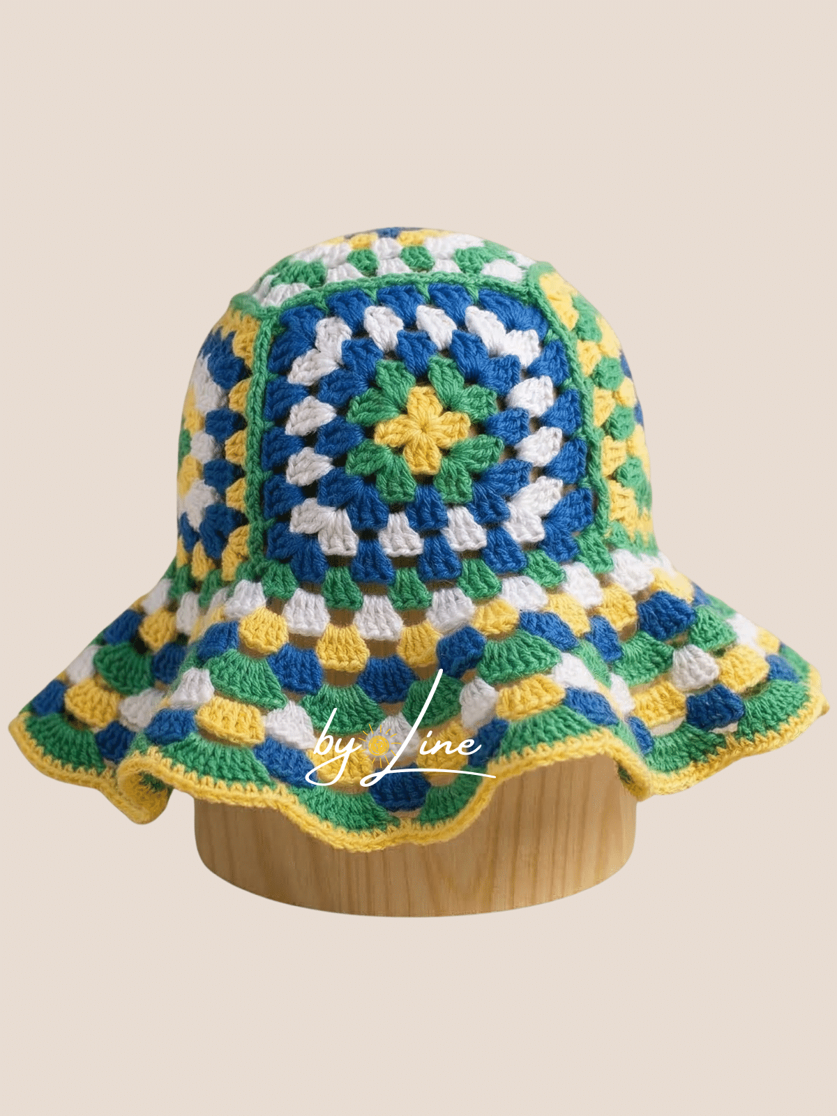 • Composição de Cores: Produzido em 4 cores (verde, amarelo, azul e branco), criando um contraste vibrante e alegre no seu chapéu square de crochê.