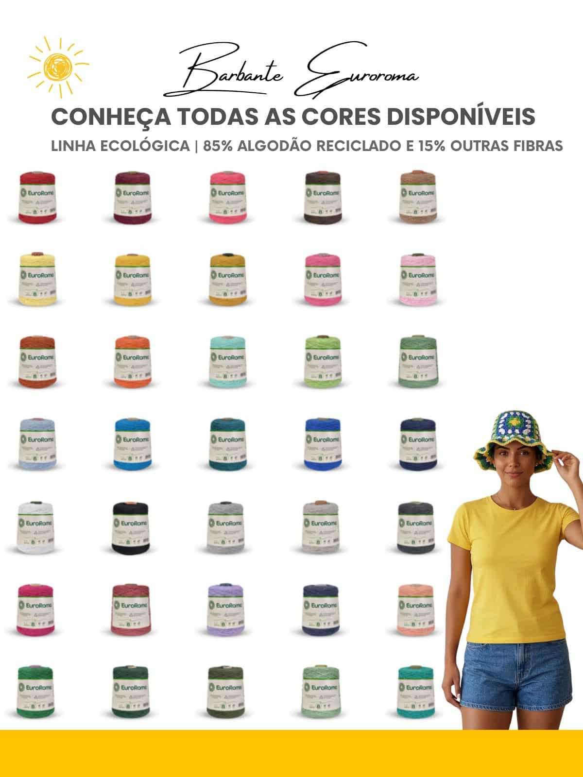 • Feito no Barbante EuroRoma 6, composto por 85% de algodão sustentável (fios de reciclagem). É uma peça com pegada ecológica que traz a resistência e a estrutura necessárias para um acessório de cabeça.