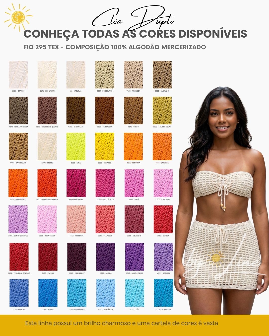 Fio Cléa Duplo: Confeccionado com o clássico fio Cléa 100% algodão, trabalhado em fio duplo. Essa técnica magistral garante que a peça mantenha a delicadeza extrema do algodão, mas com a estrutura e firmeza ideais para vestir o corpo perfeitamente.